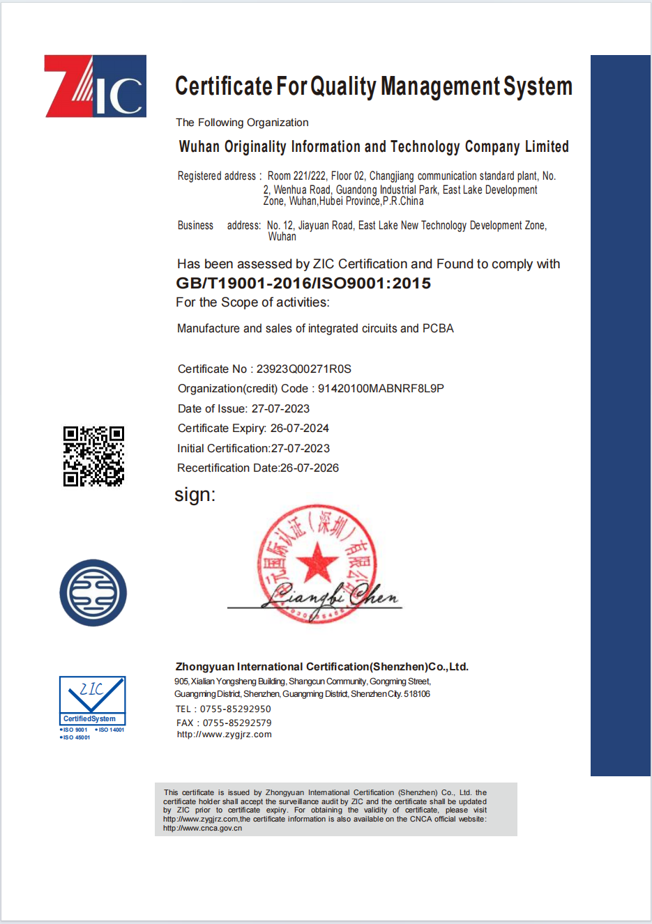 Wuhan Originality Information and Technology Company Limited successfully obtained the "Quality Management System Certification"