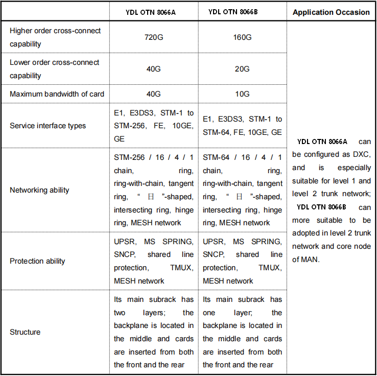 YDL MSTP 0057 equipment is mainly used in the national first-class trunk network and second-level trunk line, which can not only realize long-distance and high-speed reliable transmission, but also flexibly access low-rate equipment. The device can also be used for the core nodes of the metro backbone network, and can be mixed with various optical transmission equipment, providing operators with a complete set of solutions from the backbone network to the access network.