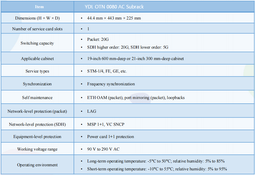 The single sub-box supports 20G packet crossover capacity, 20G SDH high-order crossover capacity, and 5G SDH low-order crossover capacity, and the line transmission rate supports 2.5 Gbit/s and 10 Gbit/s, and supports EoS
